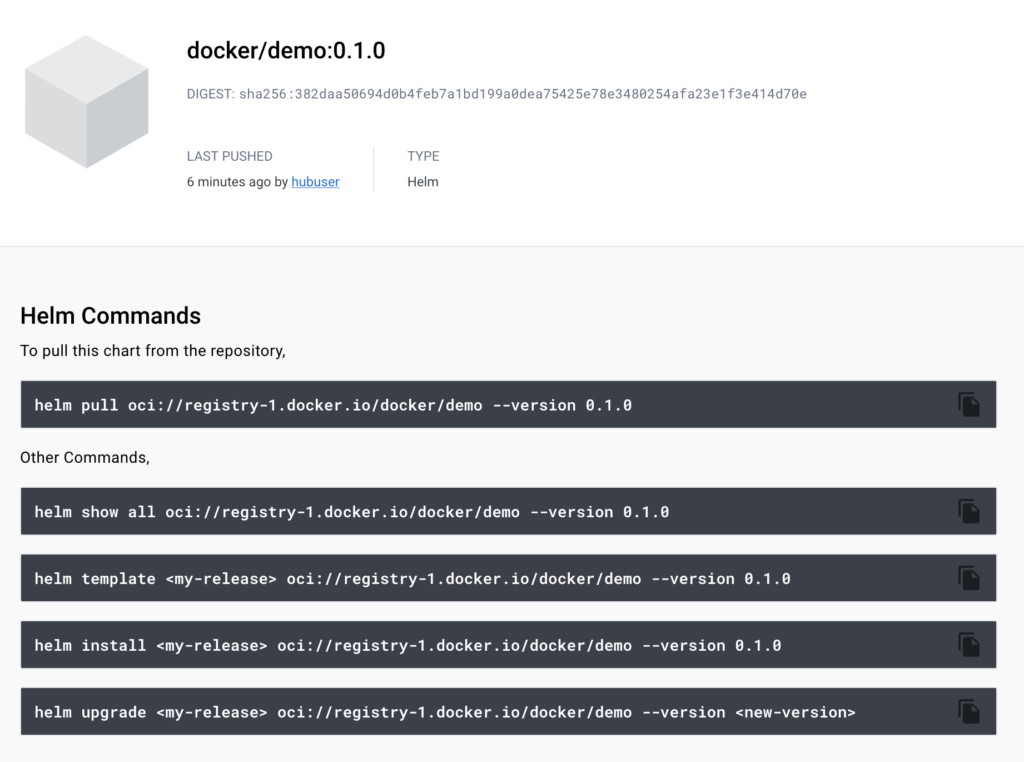 $ helm push demo-0.1.0.tgz oci://registry-1.docker.io/docker