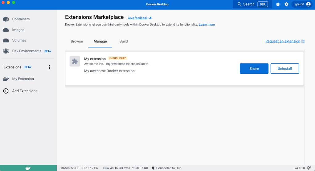 Once your extension image is accessible on Docker Hub, anyone with access to the image can install the extension.